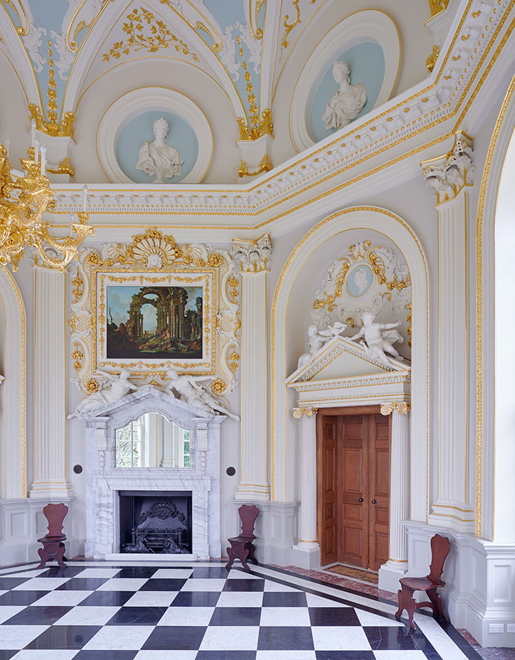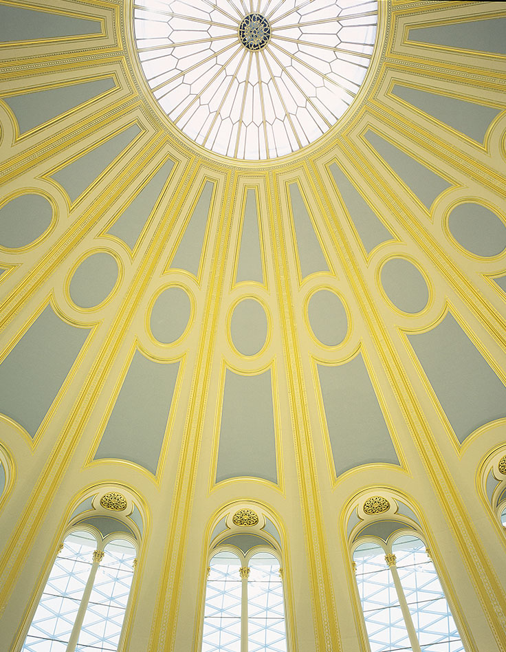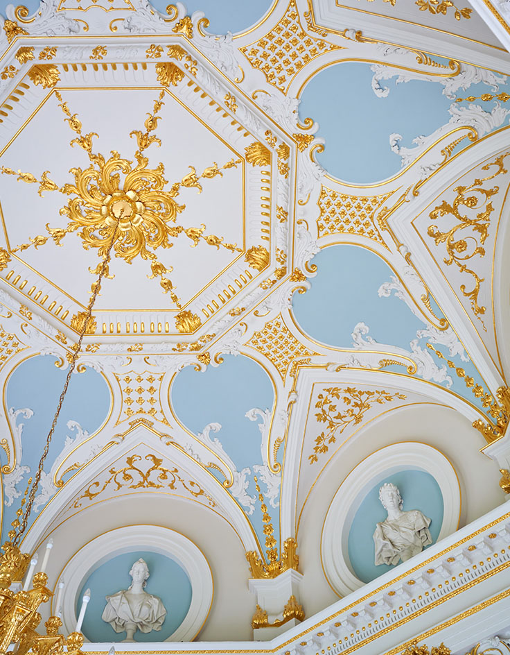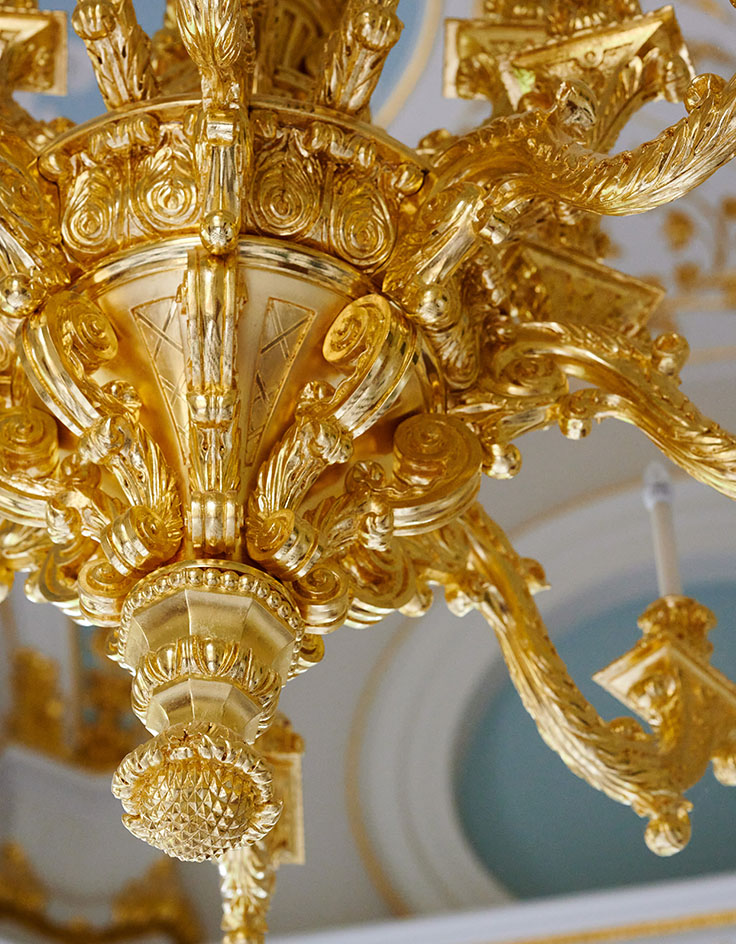 Hare & Humphreys conducted the interior restoration including the decoration and gilding. The gilding process was a painstaking labour of love, as it needed to be conducted in a dust free environment to get the best results. The colours where hand mixed on site and adjusted to suit findings from paint analysis. The hand carved chandelier was designed, carved and gilded in house and was based on meticulous research in to similar carved and gilded chandeliers of the period.