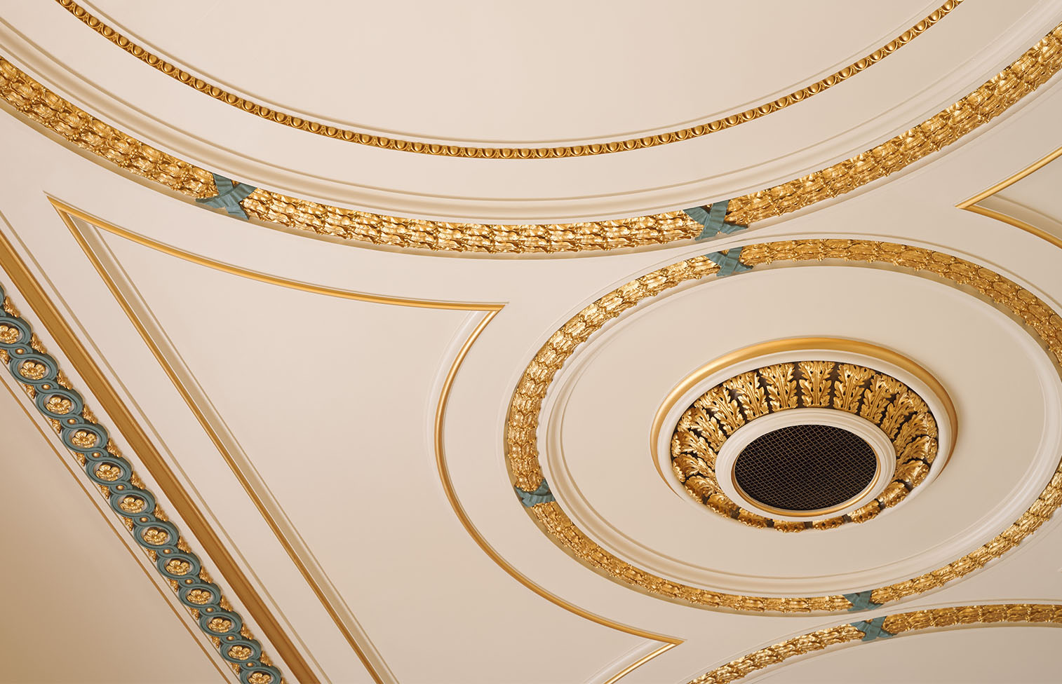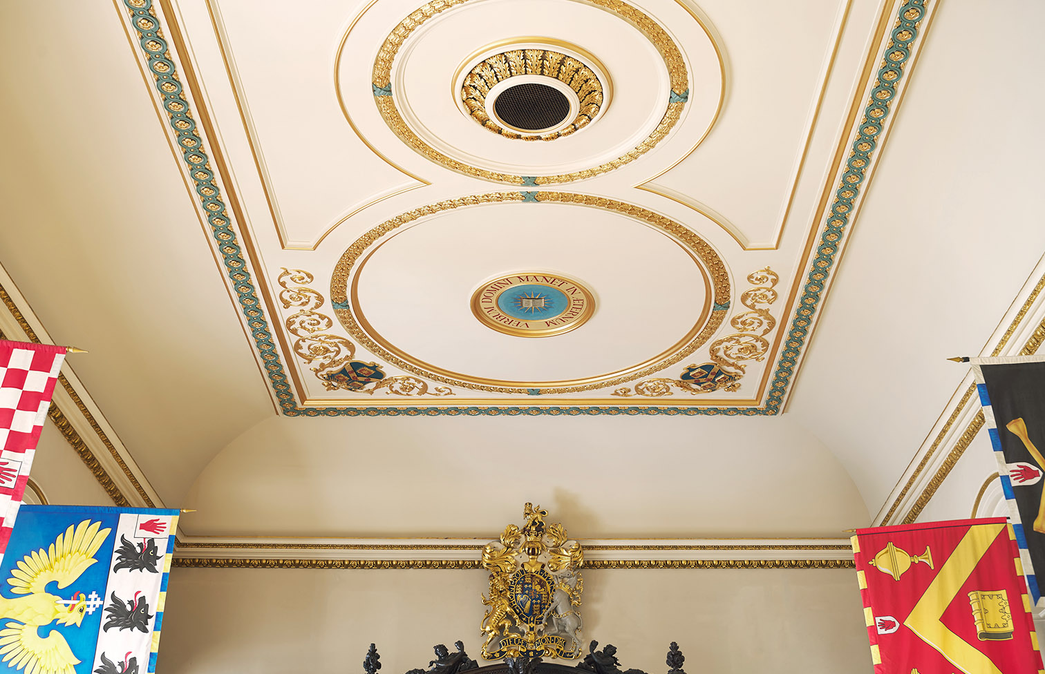 Stationers Hall was completed in 1673 after the Great Fire of London. It is one of the best surviving examples of a livery hall from this time. Hare & Humphreys undertook the restoration of the main livery hall. We were engaged to redecorate and gild the elaborate ceiling which involved cleaning down the surface and re-painting the detailed cornices and ceiling moldings, along with the application of 23.5 carat gold leaf.